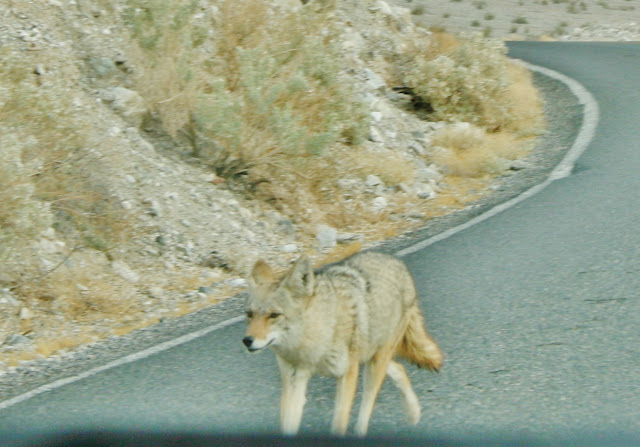 | As we turned the corner, this coyote was walking down the highway and we almost hit it. |