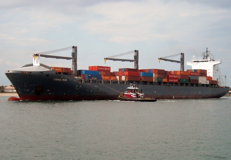 | The small tugboat was pulling this huge barge, to help it make the turn. |