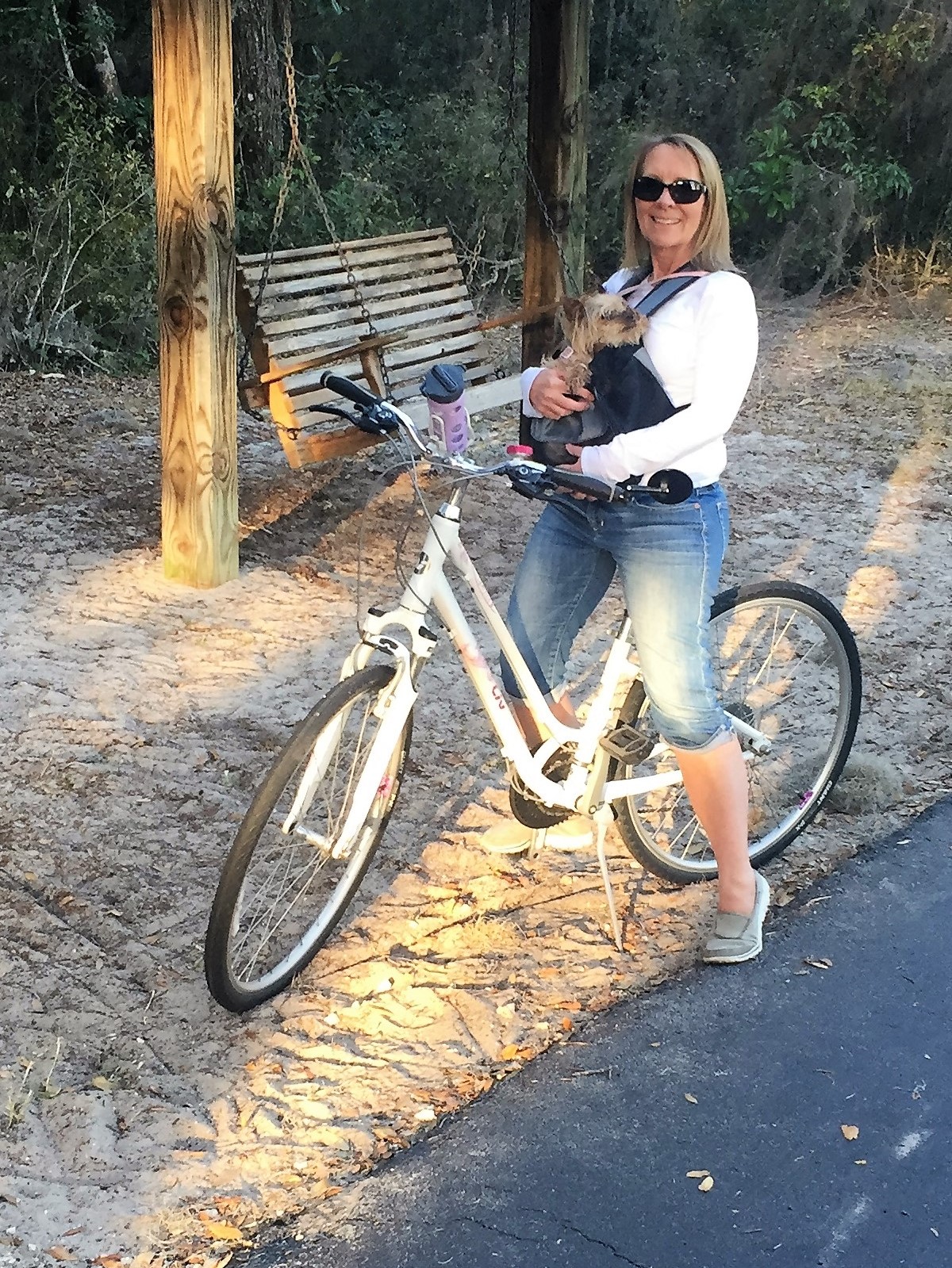 Somehow we forgot my bike's basket. Being our first year without our Nest, it was hard to think of everything. I got out my kangaroo pouch and Mallery rode this way. The only problem was every time I stopped and started, I would bump her head on the handle bars. The pouch is not a real good way to bike with your fury friend.